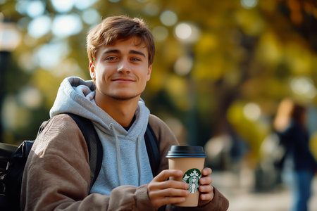 Portrait of a college student sitting on a park bench. holding a cup of Starbucks.