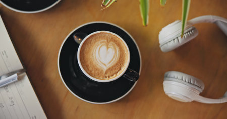 Coffee, notebook and headphones on table, top view and breakfast for cappuccino, drink and matcha in diner. Cafe, restaurant and latte with heart, espresso and book with audio tech in morning in shop