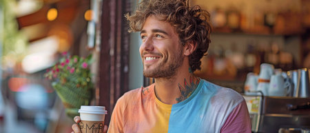 guy with a smile and a coffee cup He peered through the glass, his arm tattooed in a rainbow of a t-shirt.