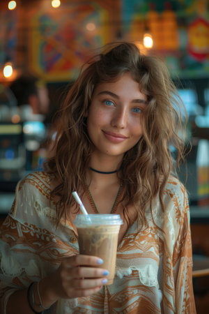 Young woman in a cafe drinks a drink with a cup