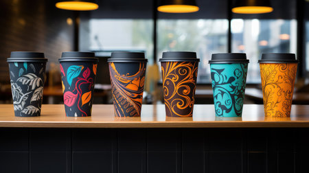 A vibrant collection of paper cups with various eye-catching patterns floating in a minimalist setting. Perfect for modern design, branding, and artistic photography.