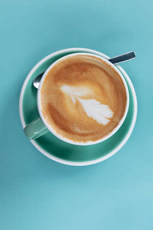 A hot latte in a green ceramic cup on a tone on tone blue turquoise background
