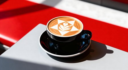 A high-quality depiction of a coffee cup featuring intricate geometric latte art, placed on a sleek modern table. The image is illuminated by bright studio lighting, enhancing the vivid hues of the cup's bold red and yellow color scheme. This sophisticated design is ideal for showcasing in cafes, design blogs, or as part of a contemporary art collection. AI-generated illustration.