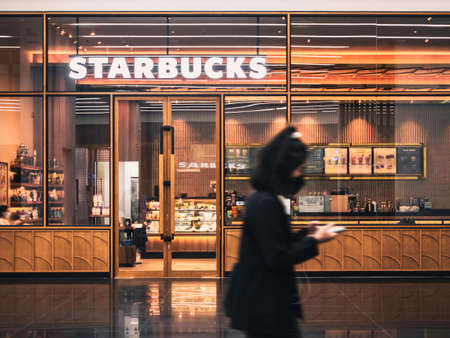 SINGAPORE - MAR 7, 2020: Starbucks coffee shop at Changi Airport in Singapore