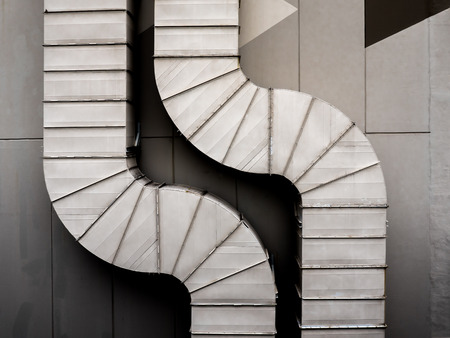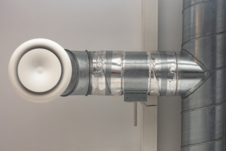 A close-up view of an industrial ductwork system showcasing metallic pipes used for air ventilation and climate control in a modern building.