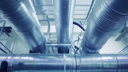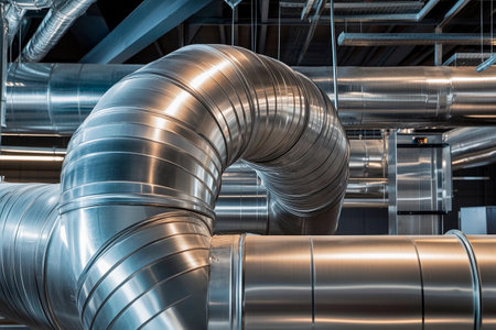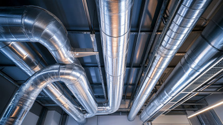 A striking view of intricate metallic ductwork and pipes in a modern industrial environment, showcasing unique lines and forms with vivid details.