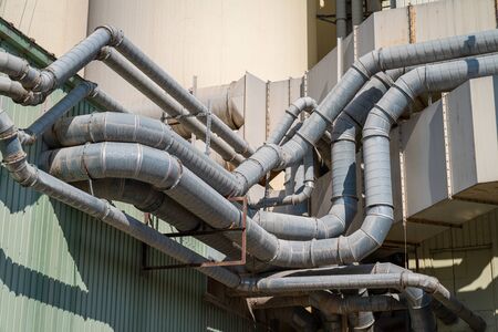 Ventilation pipes against the blue sky. Steel pipes, parts for the construction of air ducts for an industrial air conditioning system in a warehouse. Industrial ventilation equipment