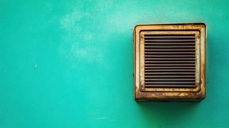 This image showcases a vintage electrical vent with a rusty finish, mounted on a bright turquoise wall, emphasizing urban design and retro elements.