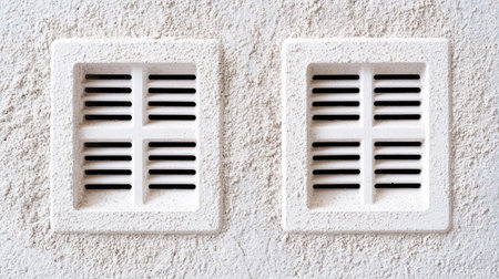 Close-up view of two white ventilation grilles set against a textured wall. The photo captures subtle shadows and patterns, ideal for design projects.