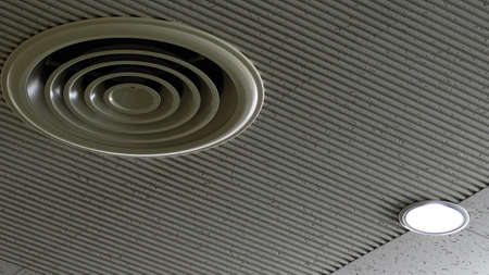 Air duct on ceiling in the mall or hospital. Air conditioner install on gypsum ceiling near ceiling lamp. Building interior concept. Air heading unit on gypsum wall. Cool system in the building.