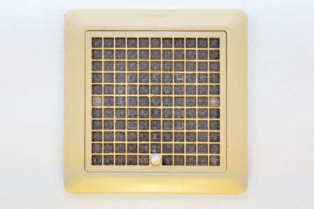 Dirty ventilation grille in the kitchen on the wall. Communication in the kitchen. Grease and dirt on the ventilation.