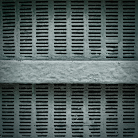 The metal grille is covering the air condition vent of the air conditioning system in the office building, front view for the background.