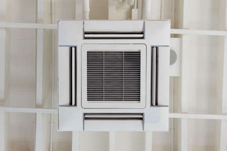 Old and dirty air duct vent hole fan on ceiling in building or home ventilation system