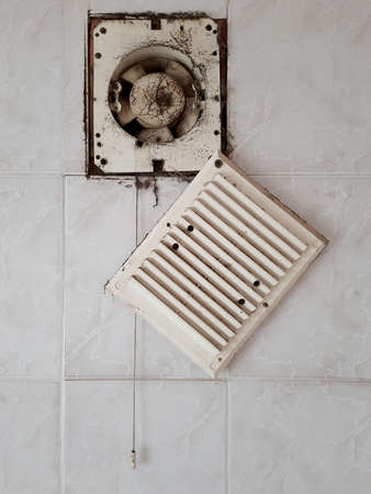 Dirty ventilation air grille with fan at home close up on white wall. Dust condition technology, dangerous old house air circulation system. Bad filtration indoors. Vertical concept