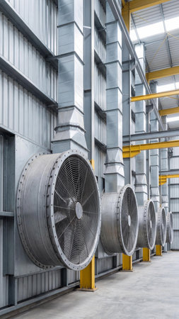 Large industrial ventilation fans installed inside a modern factory building. Metal ducts, air circulation system, manufacturing environment, engineering and industrial infrastructure concept.