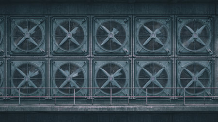 This image showcases large industrial ventilation fans set against a modern structure, highlighting dynamic lines, intricate machinery, and atmospheric lighting.