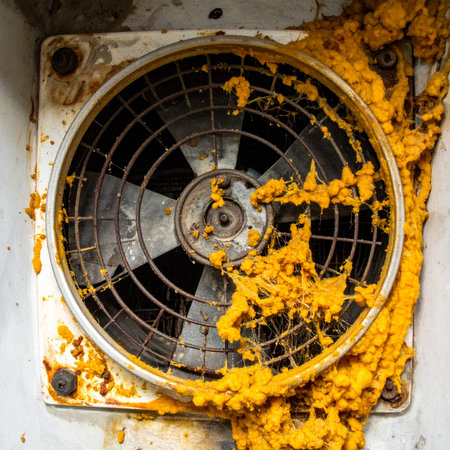 A close-up of a long-forgotten industrial exhaust fan, completely overwhelmed by a strange, expanding yellow chemical foam. The image evokes a sense of neglect, environmental hazard, and the slow decay of abandoned industrial spaces.