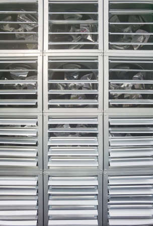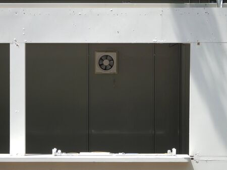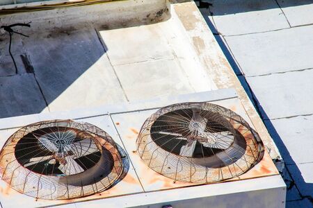 Industrial fans for air conditioning. Dirty air conditioner works behind a metal grate.