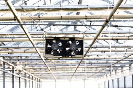 Pair of black small fans under the roof of a greenhouse, air-conditioning, heat wave or global warming concept