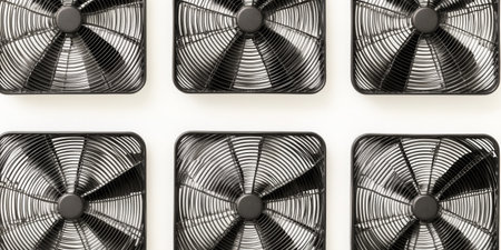 Grid of Six Black Box Fans on White Wall Minimalist and Industrial Decor Concept.