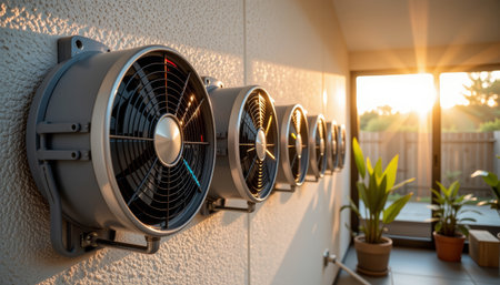 A wall mounted ventilation fans installed in row on textured wall with sunlight streaming through glass door creating warm atmosphere