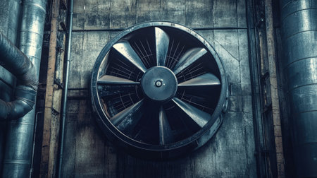 A powerful industrial ceiling fan dominates the scene in a dark factory environment, surrounded by metallic ducts and weathered concrete walls, emphasizing functionality.