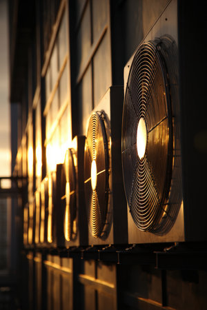 Air conditioning fans on a commercial building exterior, capturing the warm sunset reflection on metallic surfaces. The image highlights the contrast between warm and cool light.