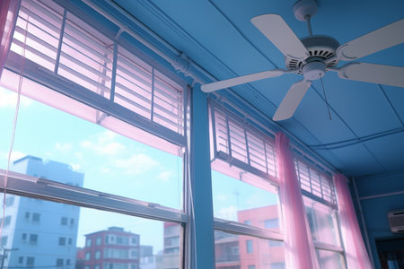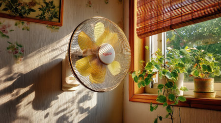 A cozy indoor scene featuring a bright fan casting intricate shadows on the wall. Green plants flourish by the window, capturing the essence of summer.