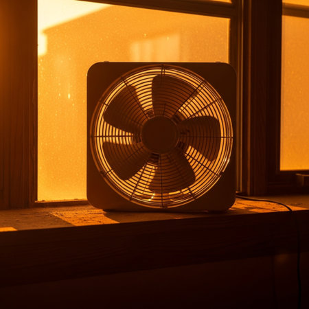 Vintage electric fan on the windowsill at sunset or sunrise.