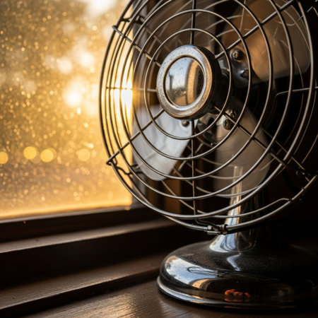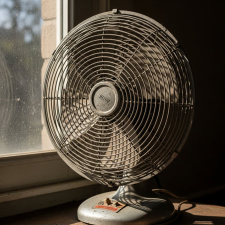 Vintage electric fan on a window sill with a blurred background.