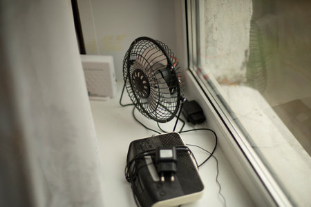 Fan is on window. Items lie on windowsill. electrical appliances at home. Household appliances in apartments.
