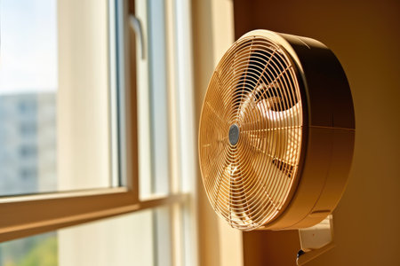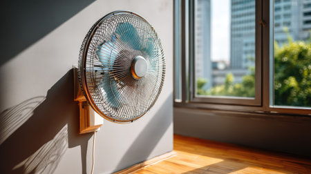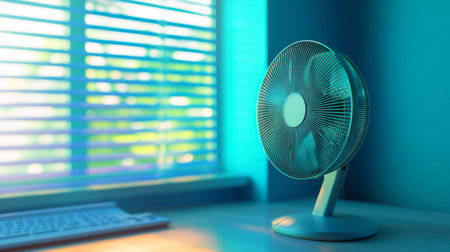 A modern desk fan positioned near a window, capturing soft light and creating a calm atmosphere. Ideal for summer interiors and comfortable living spaces.