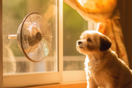 pet care. Cute dog lying on floor at home in hot day cooling under the fan, summer heat. AI Generated
