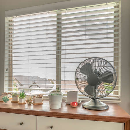 Square frame Potted cacti and electric fan on wooden cabinet against bay window of a home. A view of houses and bright sky can be seen throught the white window blinds.