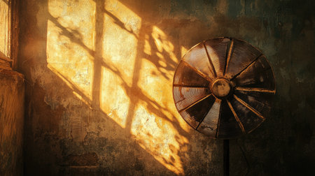 A captivating image showcasing a vintage fan and the intricate shadows it casts on a weathered wall, illuminated by streaming sunlight through an old window.
