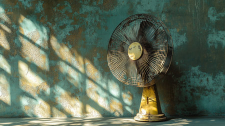 A vintage industrial fan stands against a textured wall, showcasing peeling paint and casting intricate shadows in warm natural light, perfect for decor inspiration.