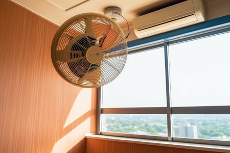 A fan sitting on top of a wooden table next to a window. AI generative image.