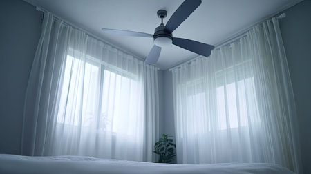 Electric ceiling fan spinning in a cozy bedroom, with soft lighting and neutral decor. Subtle motion blur on blades.
