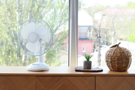 Modern electric fan and decor on wooden cabinet near window