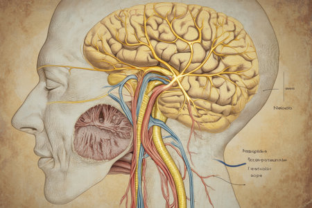 This illustration presents a side view of the human brain, showcasing nerves and blood vessels in intricate detail.