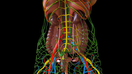 Vivid 3D illustration presents detailed anatomy of the human body, showcasing the spine, nervous system pathways, and brain structures, ideal for educational and medical illustrations.