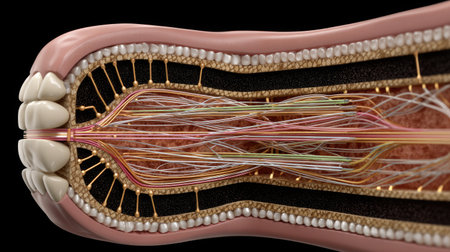 This high-resolution anatomical illustration showcases a cross-section view of a human tooth, highlighting essential elements like nerves and vessels, ideal for educational purposes.