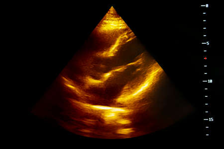 Colourful image of modern ultrasound monitor. Ultrasonography machine. High technology medical and healthcare equipment. Ultrasound imaging used in medicine. Human heart. Four chambers.