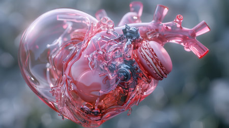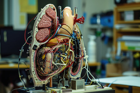 A model of a human heart is displayed in a lab, providing an educational tool for studying its structure and functions, The creation of an artificial organ, AI Generated
