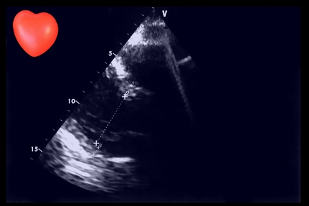 Cardiac ultrasound images and small heart . Screen of echo-cardiography machine. Doppler echo
