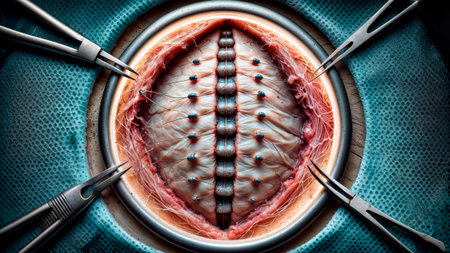 Futuristic surgery on a bionic spinal column with robotic medical instruments.