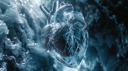 Blue crystal heart suspended in fractured ice generative ai