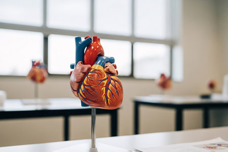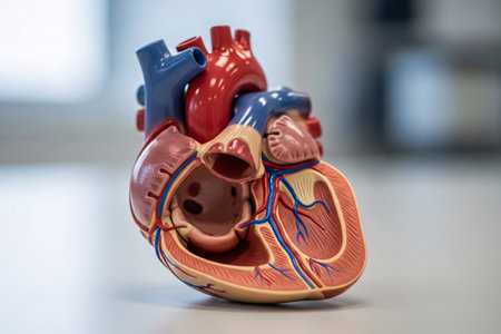 This image captures a close-up of an anatomically correct model of a human heart in a medical setting.