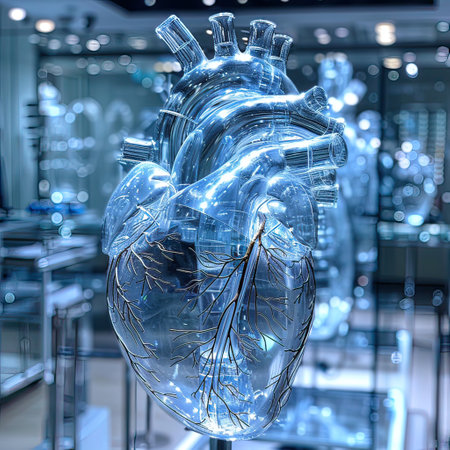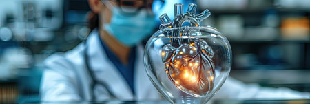 Realistic model of a human heart, placed in a futuristic lab setting