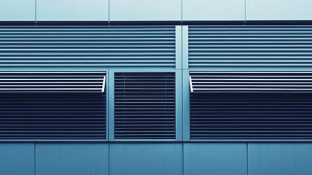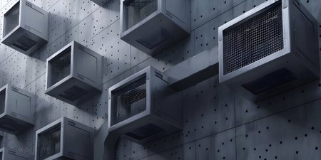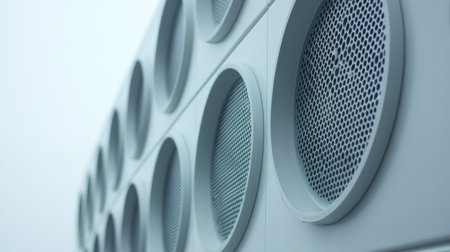 Circular vents are prominently displayed on a sleek building facade. The architectural design showcases ventilation elements in a modern urban environment, highlighting functionality and aesthetics.